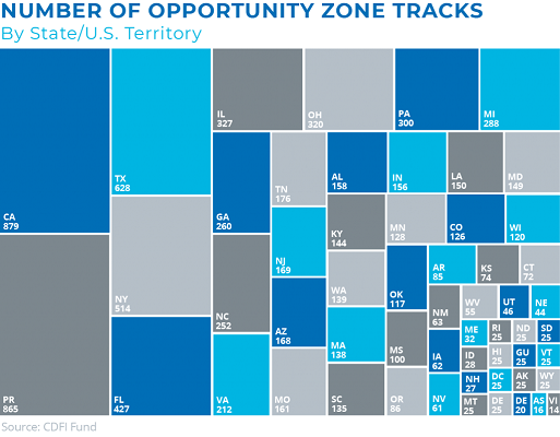 There are more than 8,700 qualified OZs around the United States and its territories, outlined here, and the table by state above provides a sense of the concentrations. They represent 25% of the census tracks in each state and territory that were eligible based on two criteria: a poverty rate of at least 20% or a median family income of less than 80% of its wider region, typically its MSA.